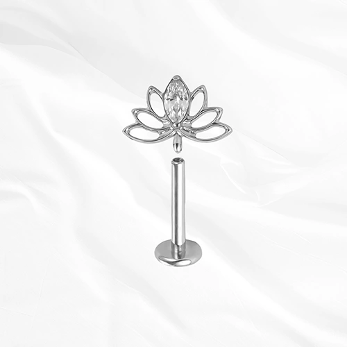 Le piercing Le Lotus Brillant est une ode à la sophistication et à la renaissance. Reprenant le design iconique de la fleur de lotus, ce modèle se pare de cristaux de haute qualité soigneusement sertis sur ses pétales, créant un jeu de lumière multidimensionnel. C’est le bijou idéal pour ceux qui souhaitent une pièce à la fois symbolique et étincelante, capable de transformer un « curated ear » en une véritable œuvre d’art joaillière.